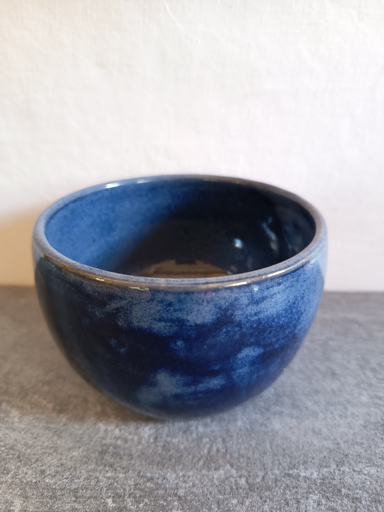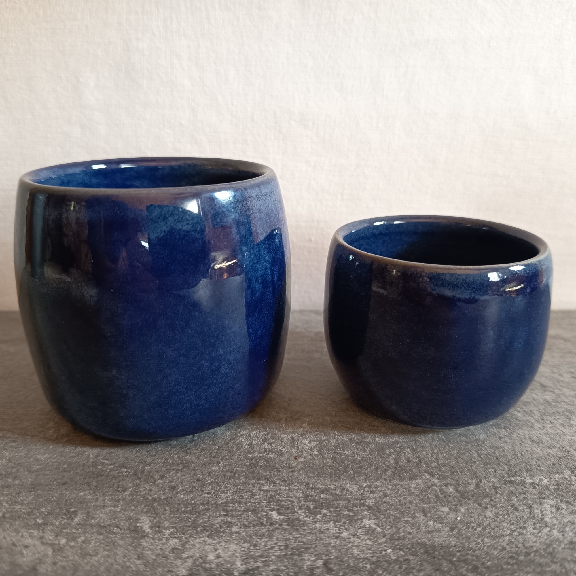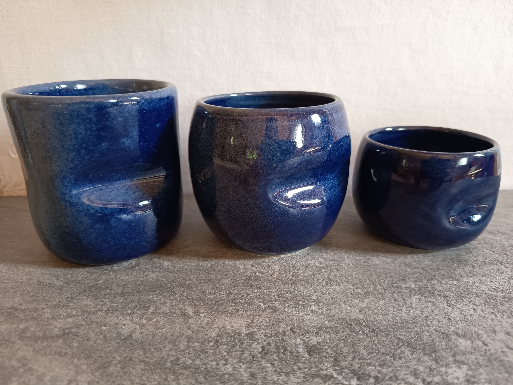 Emaillés d'un bleu foncé intense, très brillant. La surface révèle des reflets nuancés de bleu, qui varient selon la lumière et les angles de vue, donnant à chaque objet un caractère unique.