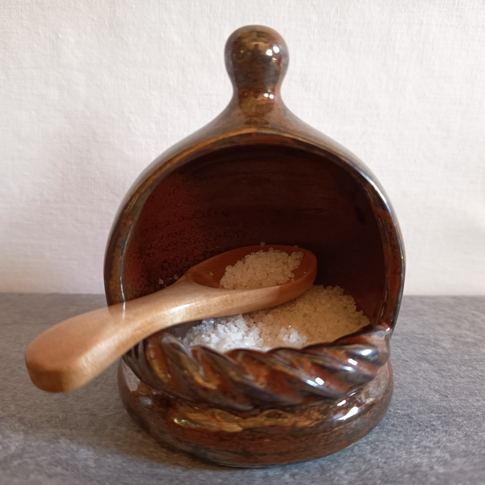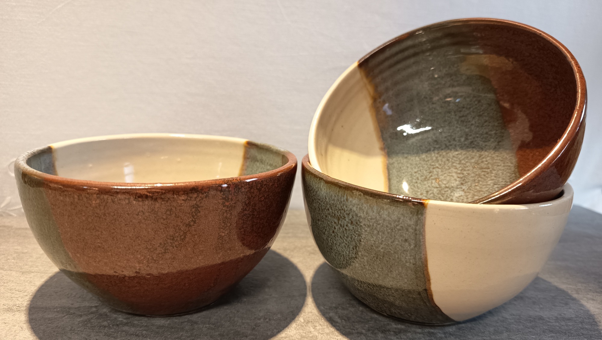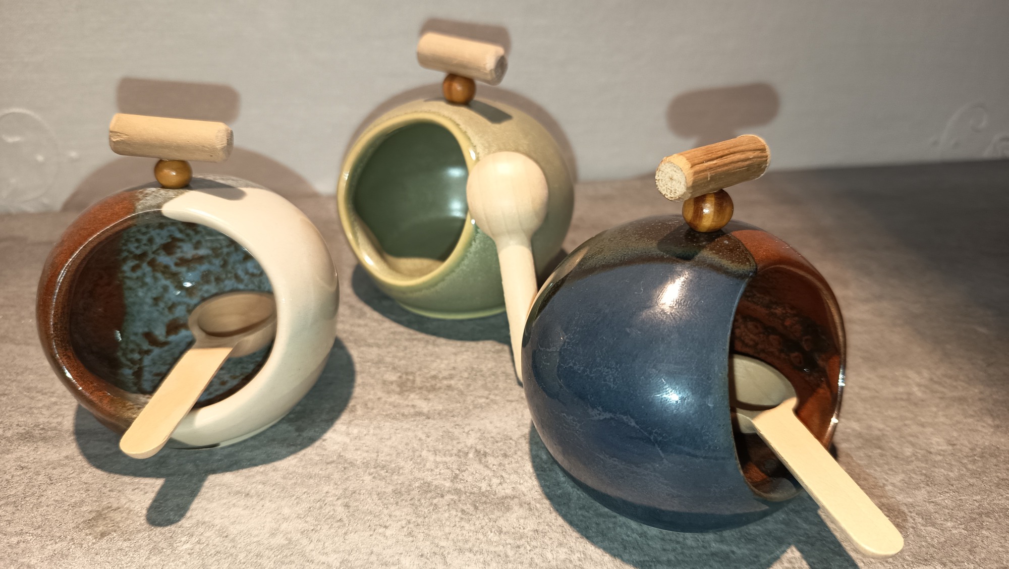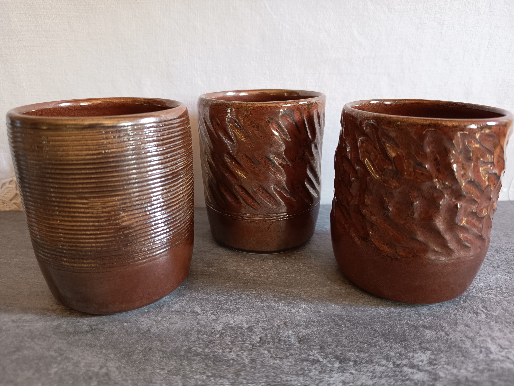 Emaillés d'un bleu foncé intense, très brillant. La surface révèle des reflets nuancés de bleu, qui varient selon la lumière et les angles de vue, donnant à chaque objet un caractère unique.
